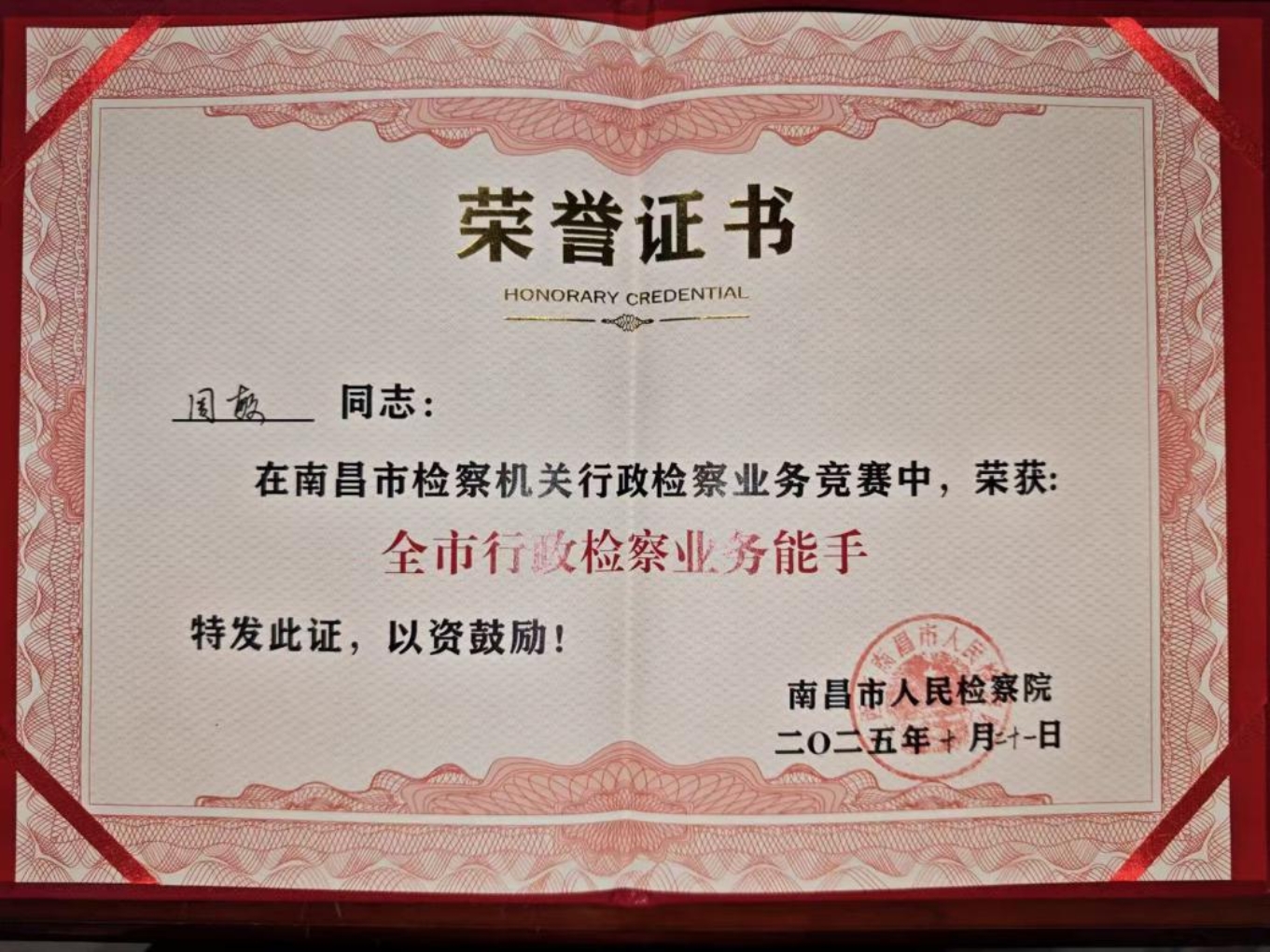 2025年10月20日至21日,南昌市检察机关行政检察业务竞赛在南昌市人民检察院举行,全市行政检察业务尖兵齐聚一堂、同台竞技。经过激烈角逐,我院检察官助理周敏荣获“全市行政检察业务能手”称号!