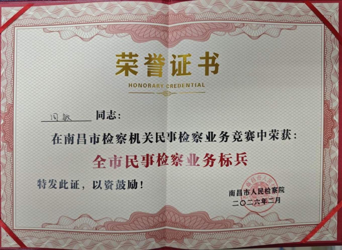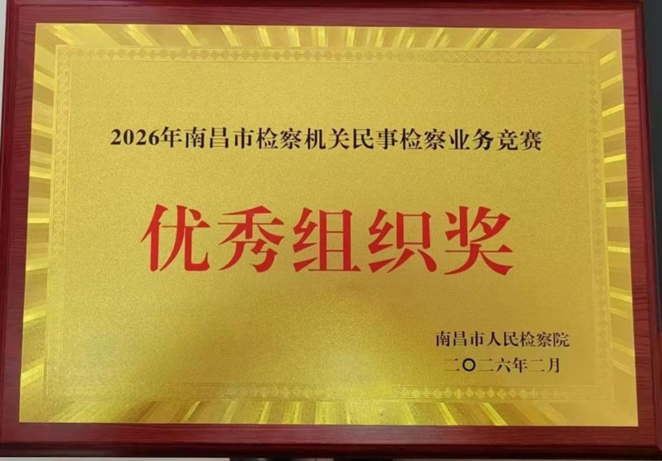 近日,在南昌市检察机关民事检察业务竞赛中,进贤县人民检察院周敏同志凭借优秀的专业素养和出色的业务能力,荣获“全市民事检察业务标兵”“案件审查与文书制作” 优胜奖等称号,进贤县人民检察院荣获“优秀组织奖”。