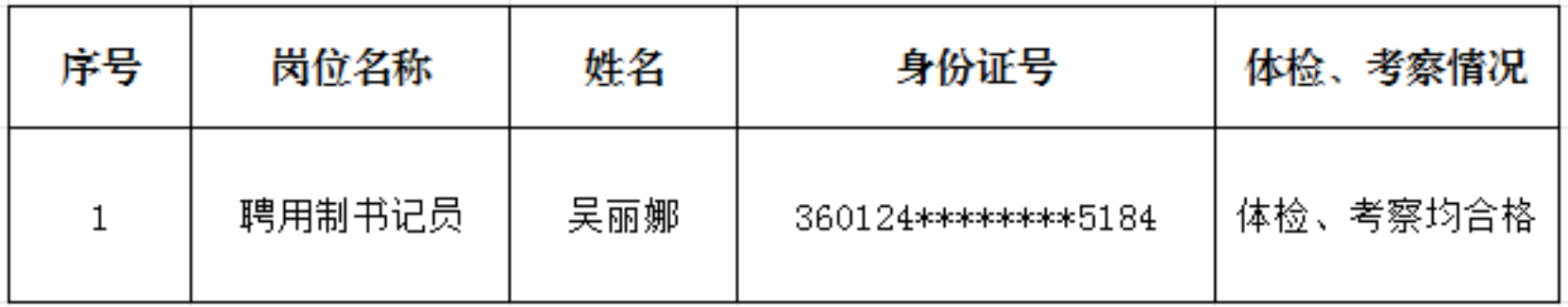 根据《江西省法院、检察院聘用制书记员管理办法(试行)》《江西省法院、检察院聘用制书记员公开招聘办法》和有关规定,进贤县人民检察院聘用制书记员补录体检、考察工作已结束,现将拟补录人员公示如下: